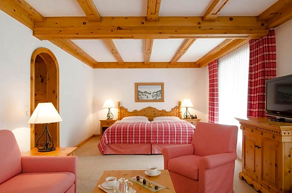 Some suites are decorated with stone pine wood panels. The suite offers a separate bedroom and walk-in wardrobe. It consists of a spacious living room, a marble bathroom and views of the surroundings and valley.